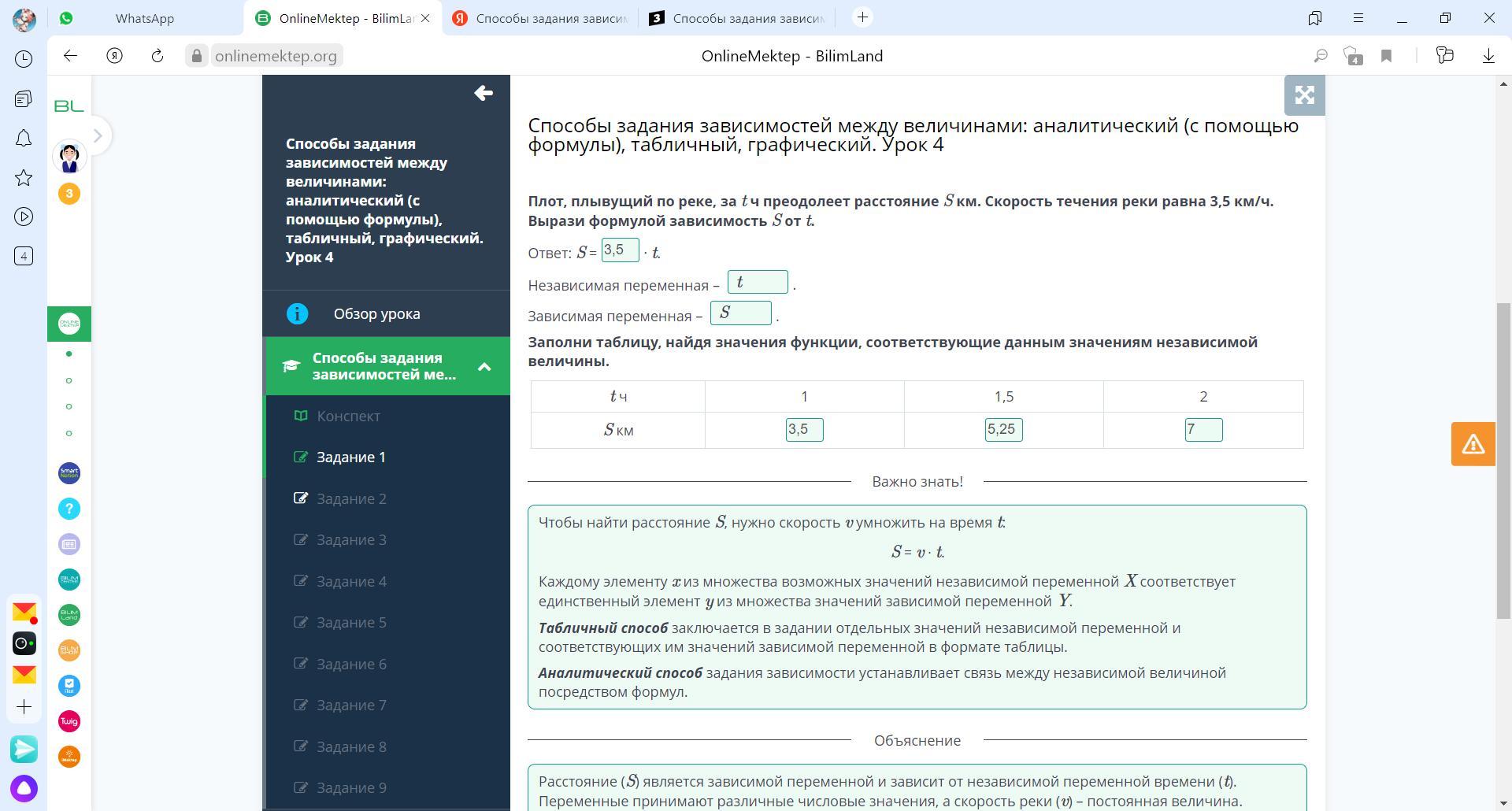 Плот, плывущий по реке, за t ч преодолеет расстояние S км. Скорость течения реки равна 3,5 км/ч. Вырази формулой зависимость S oт t.
