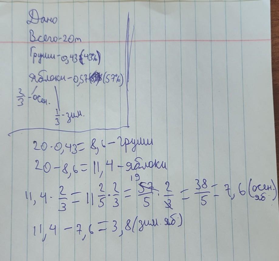 На складе 20 тонн фруктов, из которых 43% составляют груши, а остальное - яблоки. Из яблок 2/3 - это осенние сорта, а остальные - зимние сорта. Вычисли, сколько тонн на складе груш, сколько осенних яблок и сколько зимних.