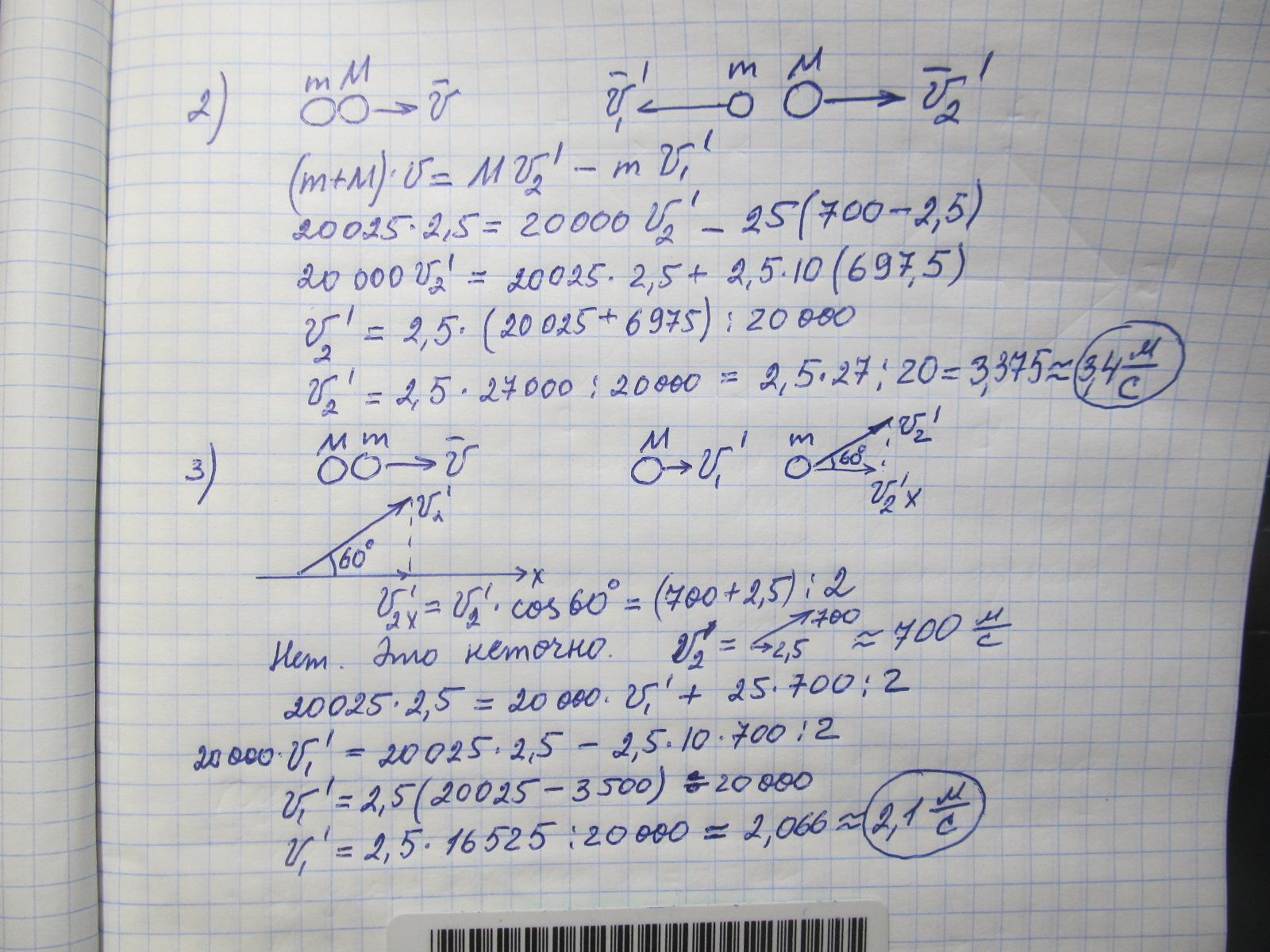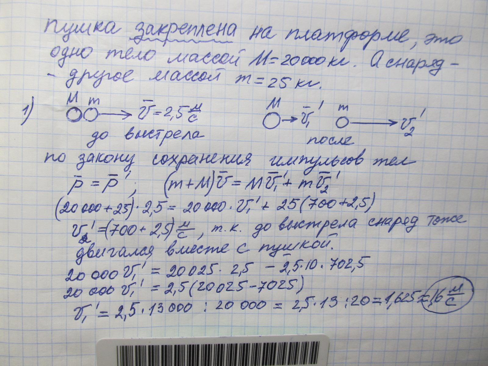Железнодорожная платформа движется со скоростью 2.5 м / с. Из пушки, закрепленной на платформе, сделали выстрел. Масса снаряда 25 кг, его скорость 700 м / с, а масса платформы с пушкой 20000 кг. Определите скорость платформы после выстрела, если выстрел сделали в направлении движения платформы; а) в обратном направлении; б) ствол пушки во время выстрела составляет угол 60 ° с направлением движения. На силы сопротивления не учитывать