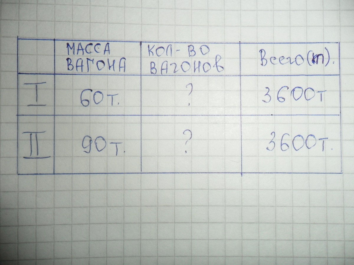 на завод отправлено 3,600 тонн угля в вагонах, по 60 тонн в каждом, и столько же угля в вагонах, по 90 тонн в каждом. Каких вагонов потребовалось больше и на сколько больше? Как записать условие таблицей?