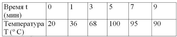 В таблице приведены данные о температуре воды в емкости в зависимости от времени.