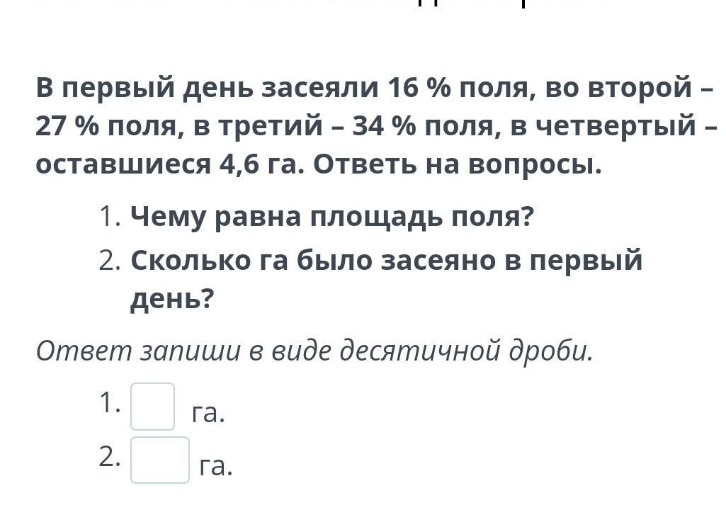 В первый день засеяли 16 % поля, во второй – 27 % поля, в третий – 34 % поля, в четвертый – оставшиеся 4,6 га. Ответь на вопросы.