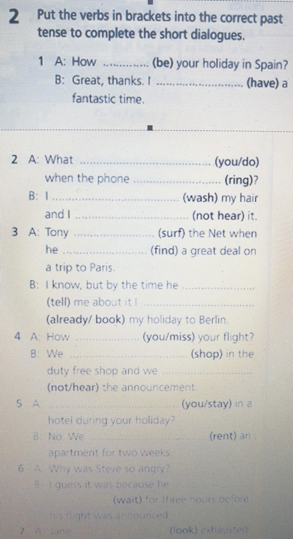 1) How was your holiday in Spain? Great, thanks. I had a fantastic time