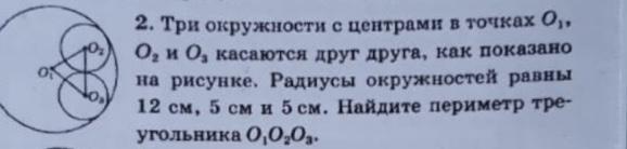 если от края до центра О1 12 см, а радиус О2 и О3 5 см, то можно выянснить что 5+5=10 а 12-10=2, тогда 1 сторона треугольника будет равна 7 см (5+2).