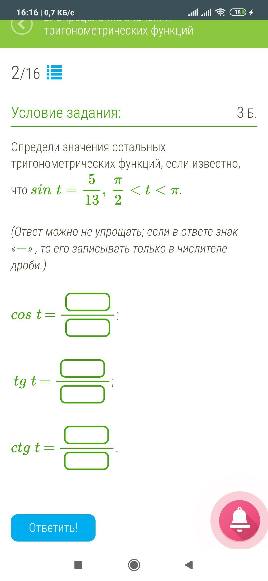 Определи значения остальных тригонометрических функций, если известно, что sint=513,π2