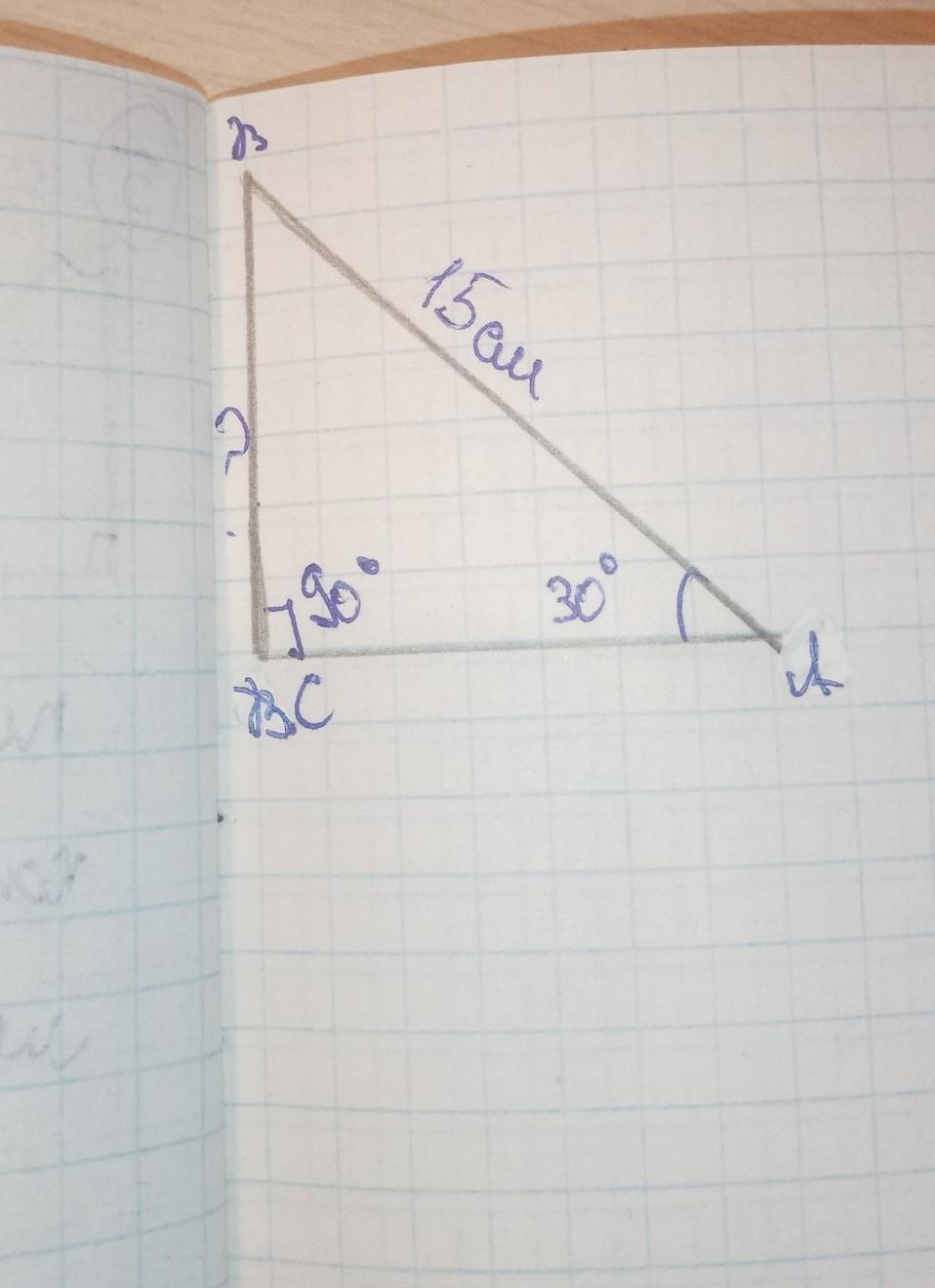 по свойству угла в 30 градусов в прямоугольном треугольнике, сторона, лежащая против угла в 30 градусов рана половине гипотенузы=> ВС=15:2=7, 5