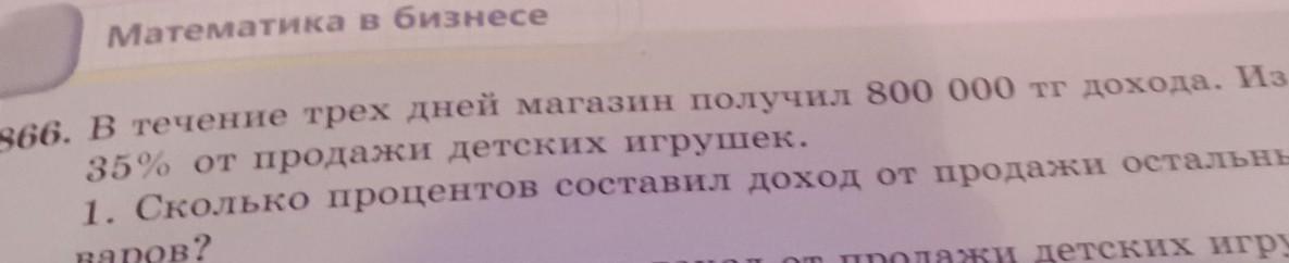 в течение 3 дней магазин получил в 800000 тенге дохода и из них 35% от продажи детских игрушек 1)сколько процентов составила доход от продажи основных товаров. 2) сколько тенге составил доход от продажи детских игрушек 3) на сколько тенге больше получил магазин от продажи остальных товаров чем от продажи игрушек