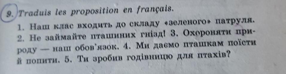 . 1. Notre classe fait partie de la «patrouille verte. 2. Ne pas occuper les nids d'oiseaux 3. Protéger le genre - notre devoir. 4. Nous donnons à manger et à boire aux oiseaux. 5. Avez-vous fabriqué une mangeoire à oiseaux?