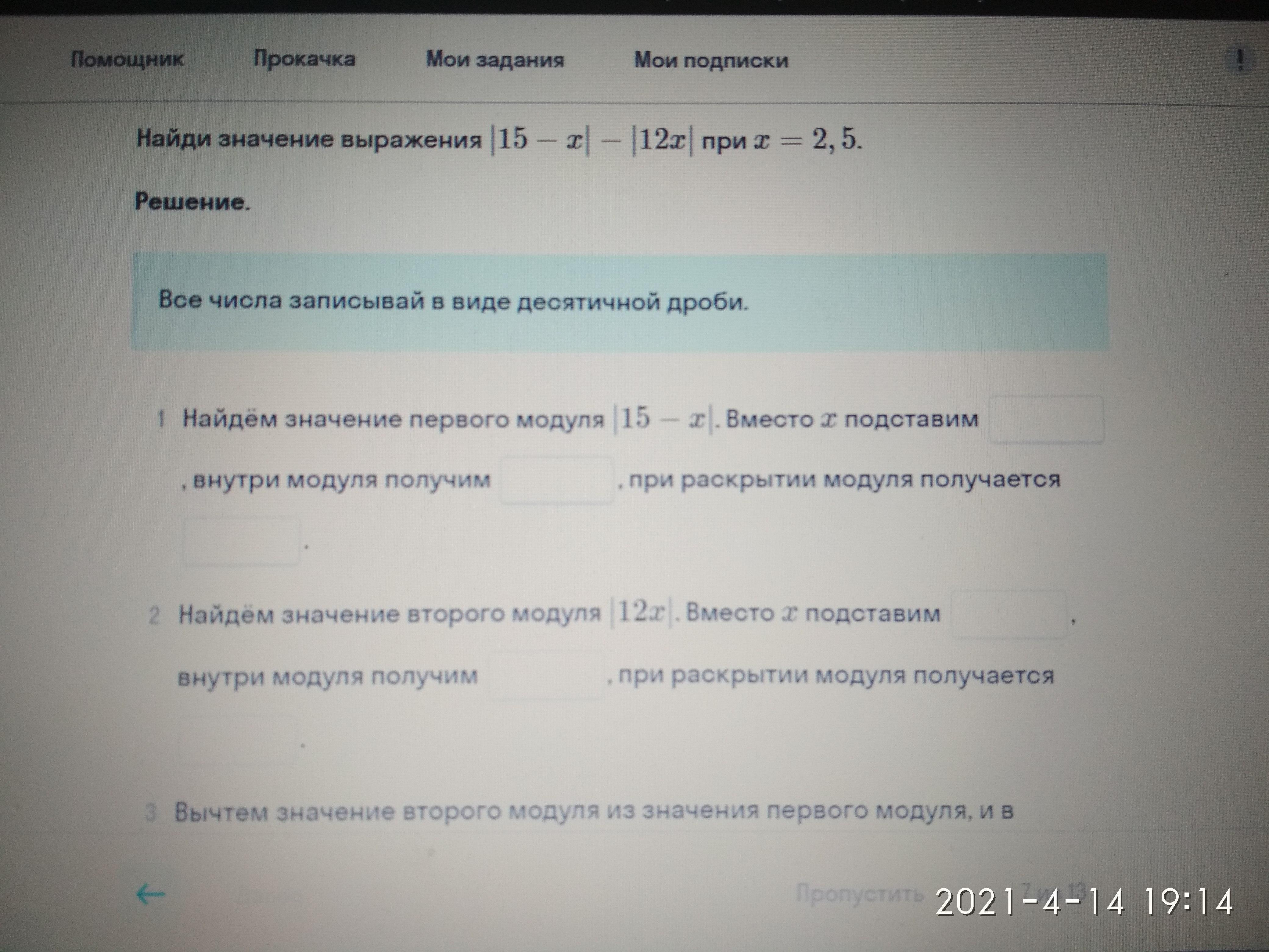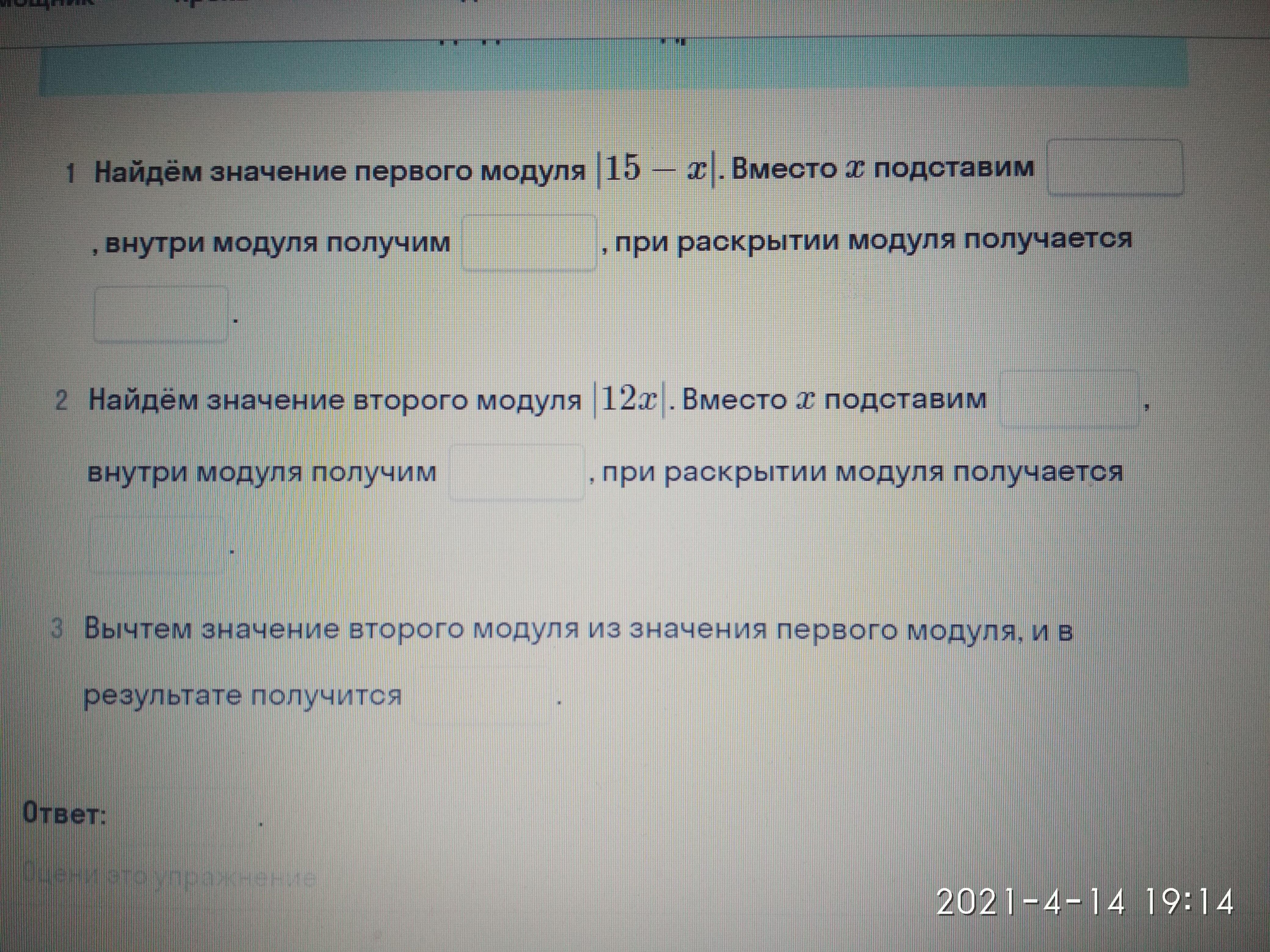 Помогите пожалуйста, найти значение выражения |15-x|-|12x| при х = 2,5 помогите пожалуйста