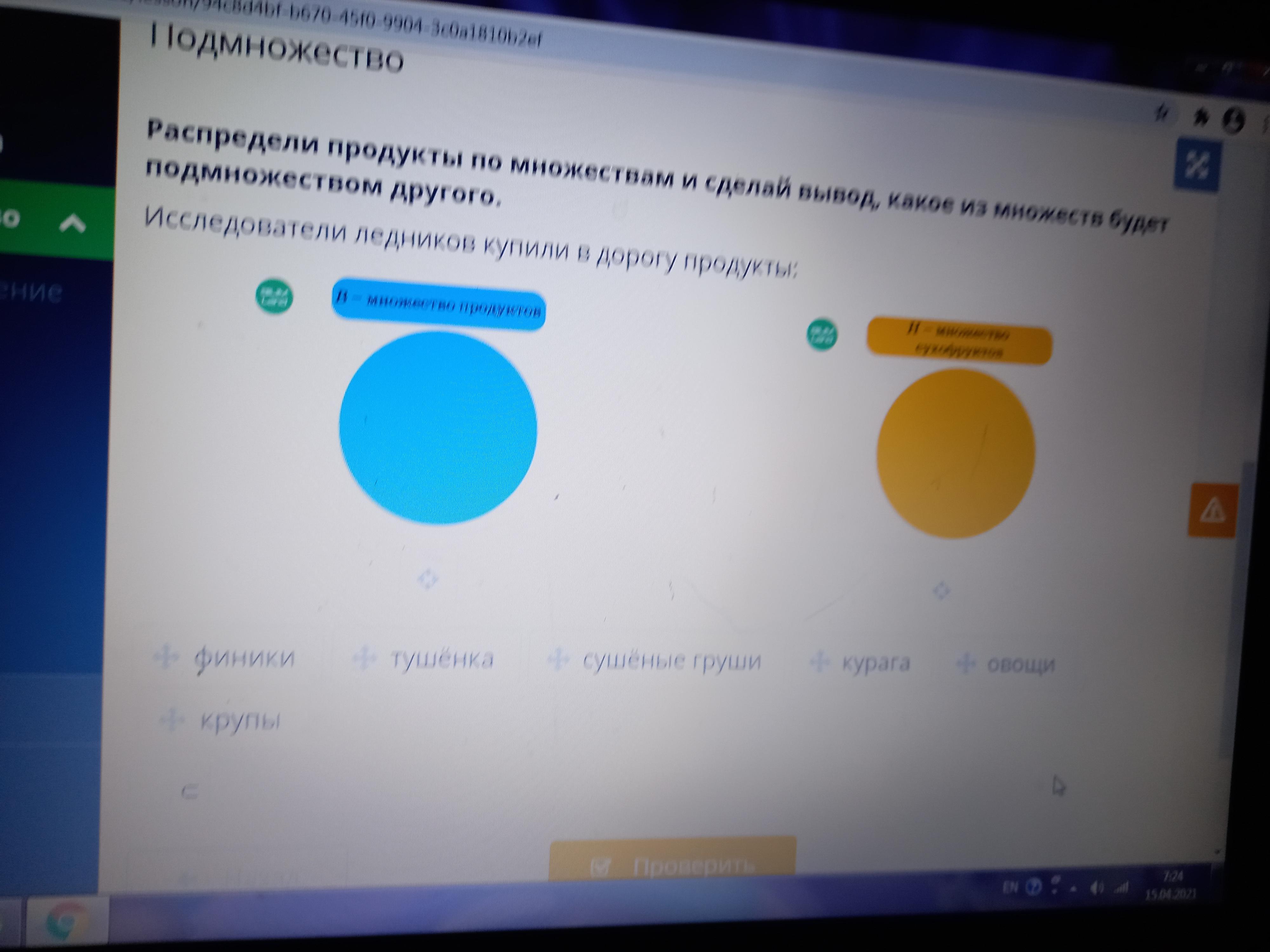 Множество продуктов(синий кружок, множество): финики, тушёнка, сушеные груши, курага, овощи, крупы.