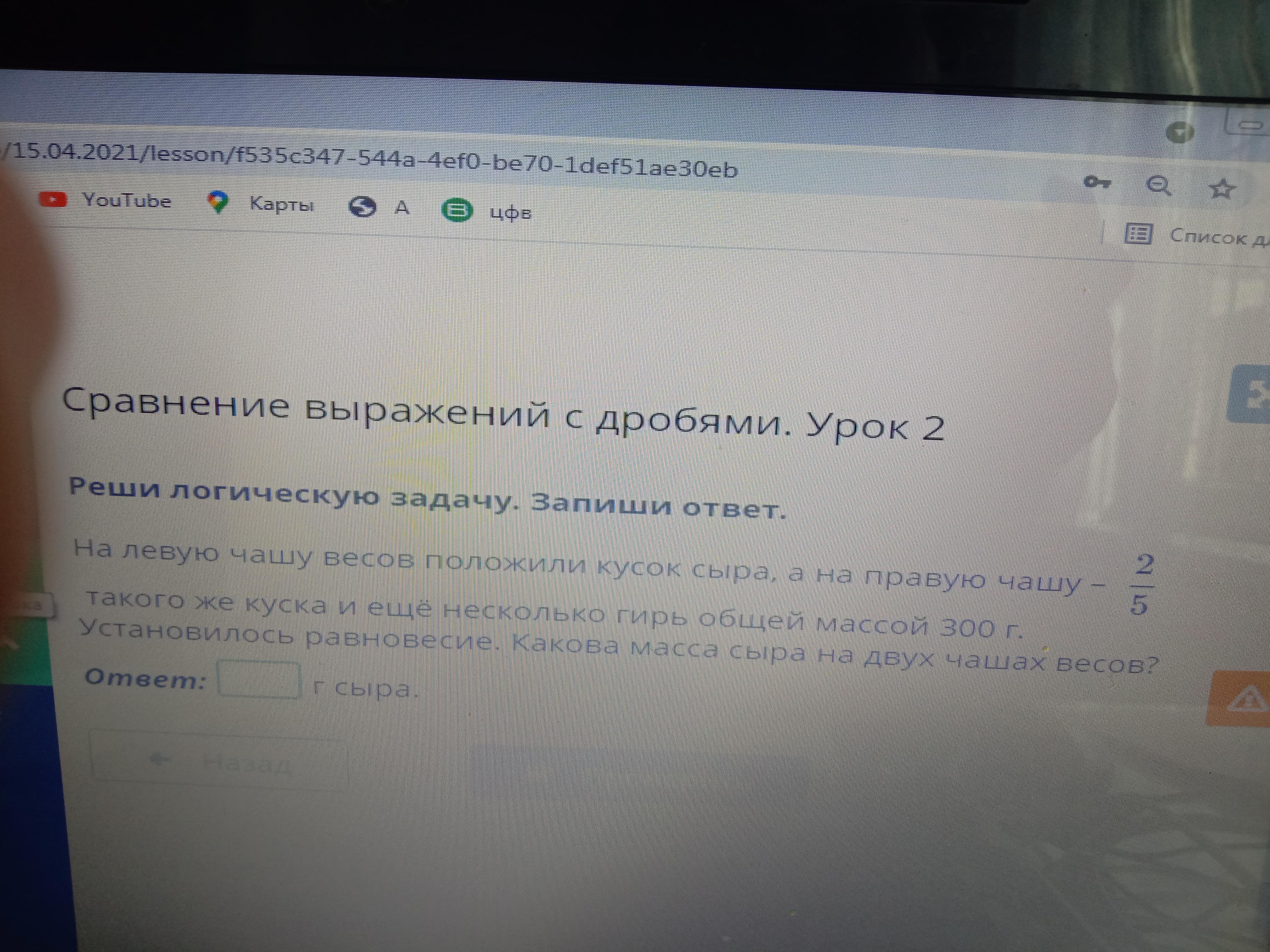 5/5 - 2/5= 3/5 то есть 300 грамм гири и является 3/5 и осталось ток прибавить 300 + 200