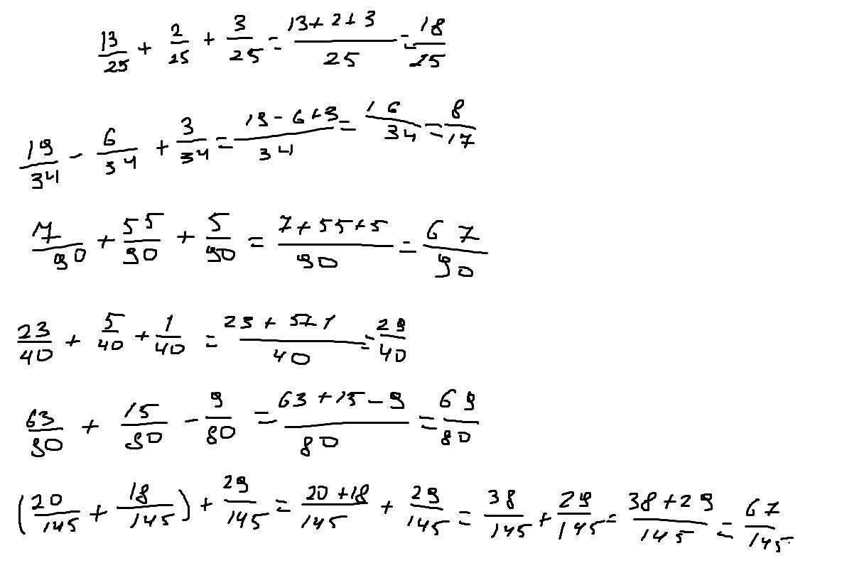 работа в паре третье задание Вычисли 13/25 плюс 2/25 плюс 3/25 равно 19/34 - 6 / 34 + 3 / 34 равно 7 / 90 + 55 / 90 + 5 / 90 равно 23 / 40 + 5 / 40 + 1 / 40 равно 63 / 80 + 15 / 80 минус 9/8020 20/145 + 18/145 + 9/29 / 145 равно