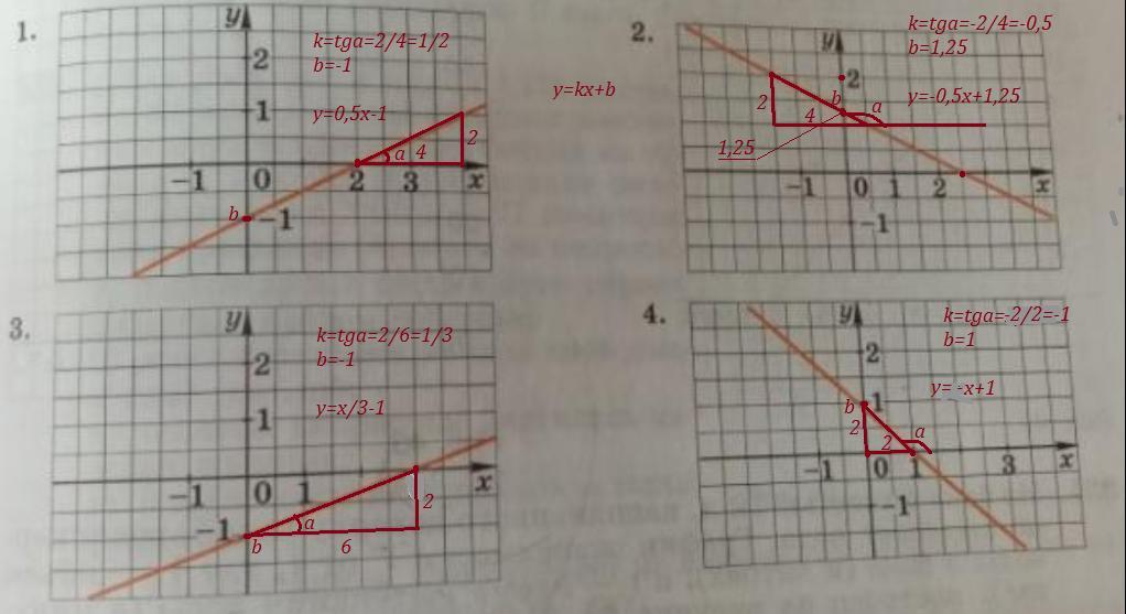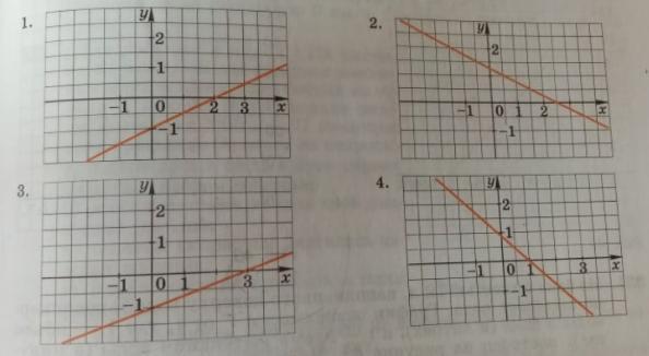 1) y=0,5x-1 ; 2) y= -0,5x+1,25 ; 3) y=(x/3)-1 4) y= -x+1