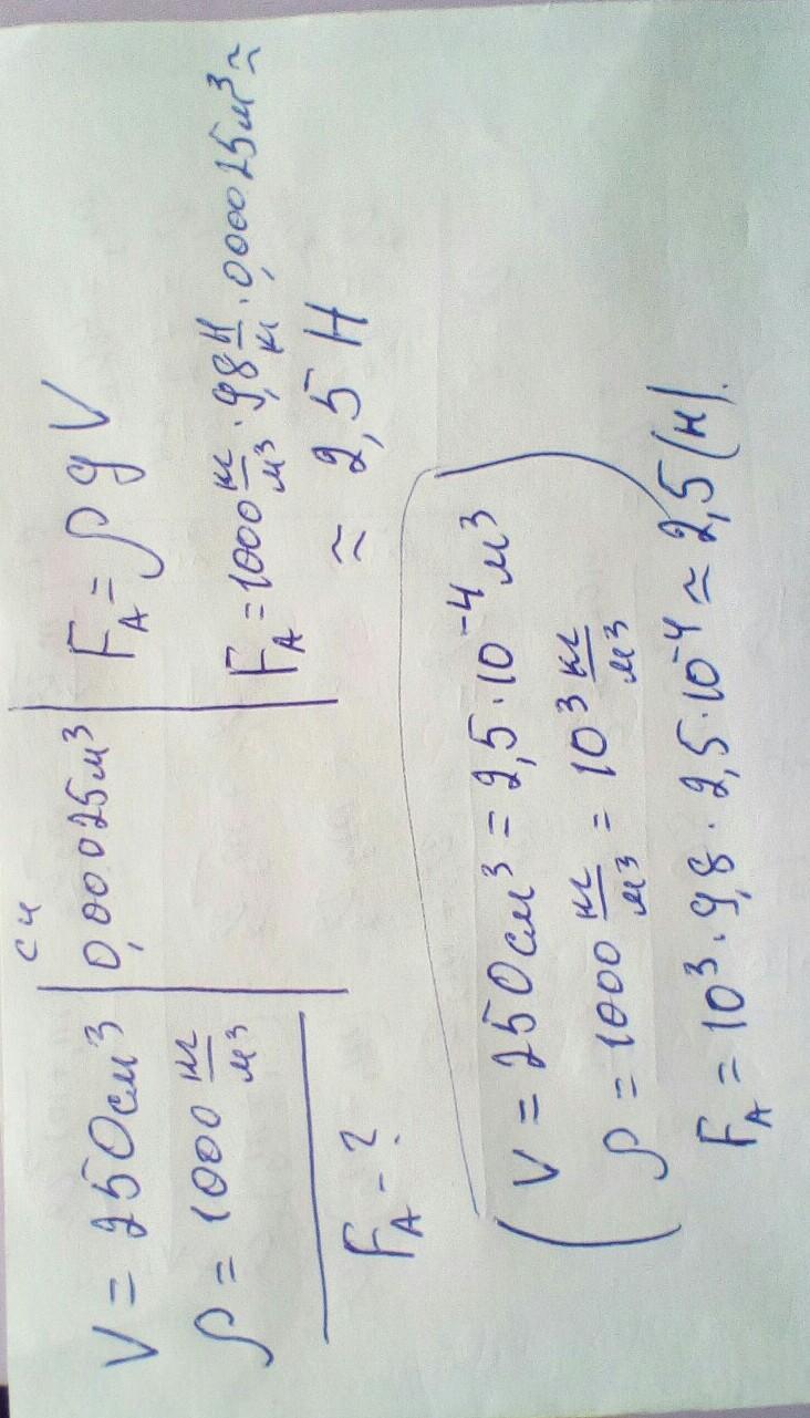 Тело объёмом 250см³ погружено в воду. Вычислите архимедову силу, действующую на это тело. Плотность воды 1000 кг/м³