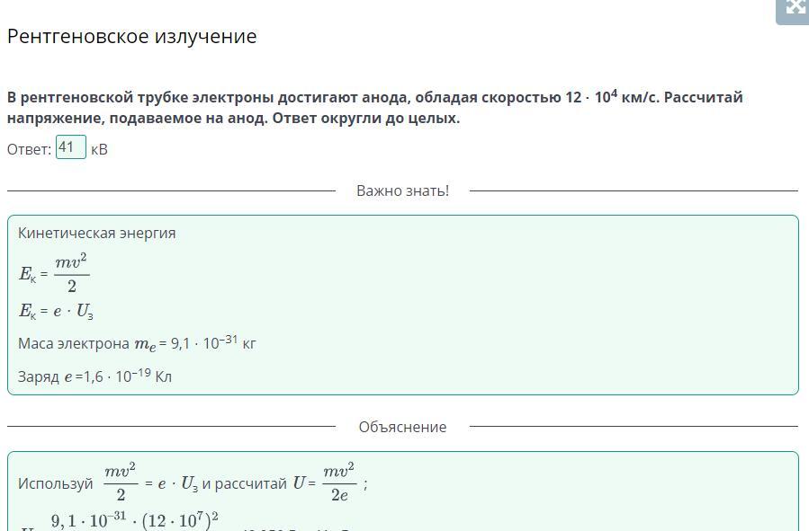 В рентгеновской трубке электроны достигают анода, обладая скоростью 12 ⋅ 104 км/с. Рассчитай напряжение, подаваемое на анод. Ответ округли до целых.