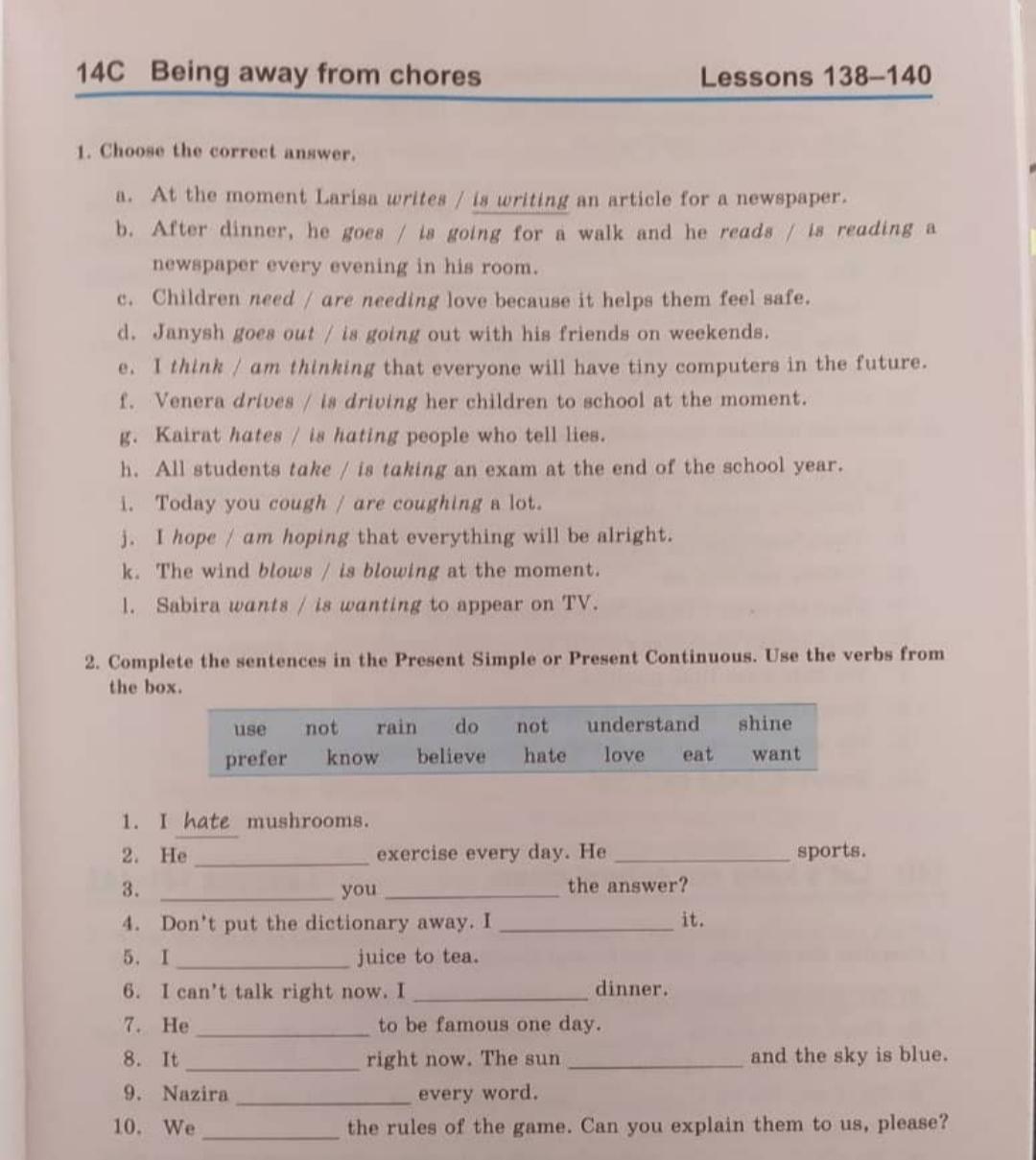 Даю 100 баллов. 1) Choose the correct answer. 2) Complete the sentences in the Present Simple or Present Continuous. Use the verbs from the box.