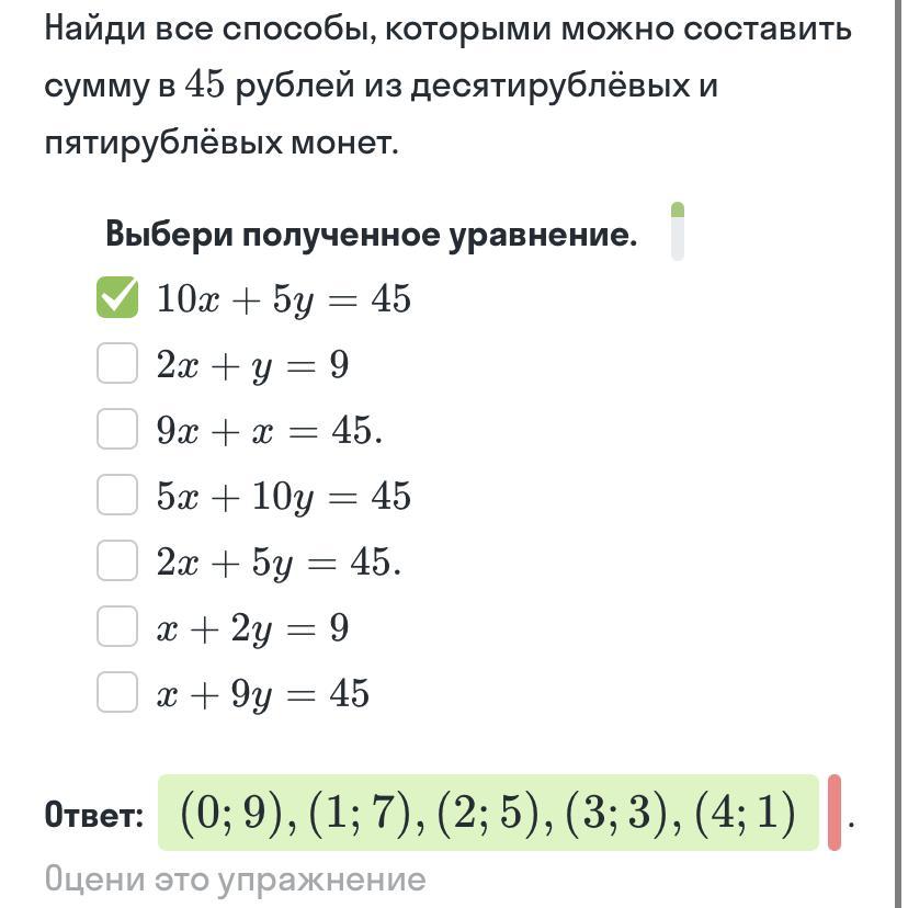 Найди все способы,которыми можно составить сумму в 45 рублей из десятирублевых и пятирублевых монет.