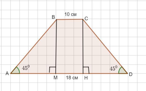 Проведем высоты ВМ и СН. Тогда если трапеция равнобедренная, то AM= DH . МН=ВС= 10 см ( как отрезки, заключенные между параллельными прямыми) . Значит, AM= DH=(18 - 10): 2 =8: 2=4 см .