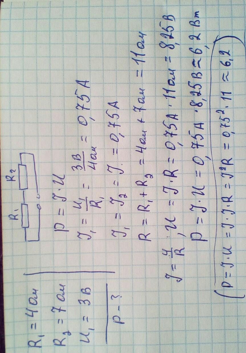 Определите мощность потребляемой участок электрической цепи, состоящей из двух последовательно соединенных резистора, опорами 4 Ом и 7 Ом. Напряжение на резисторе 4 Ом равна 3 В.