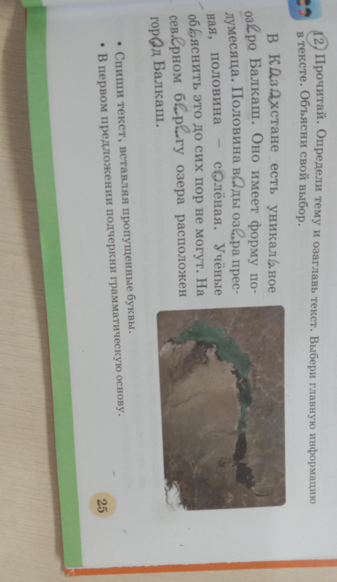 Тема текста - озеро Балкаш, что находится в Казахстане. Описывается какая в нём вода, форма (на что он похож), а также что на береге расположен город с таким же названием.