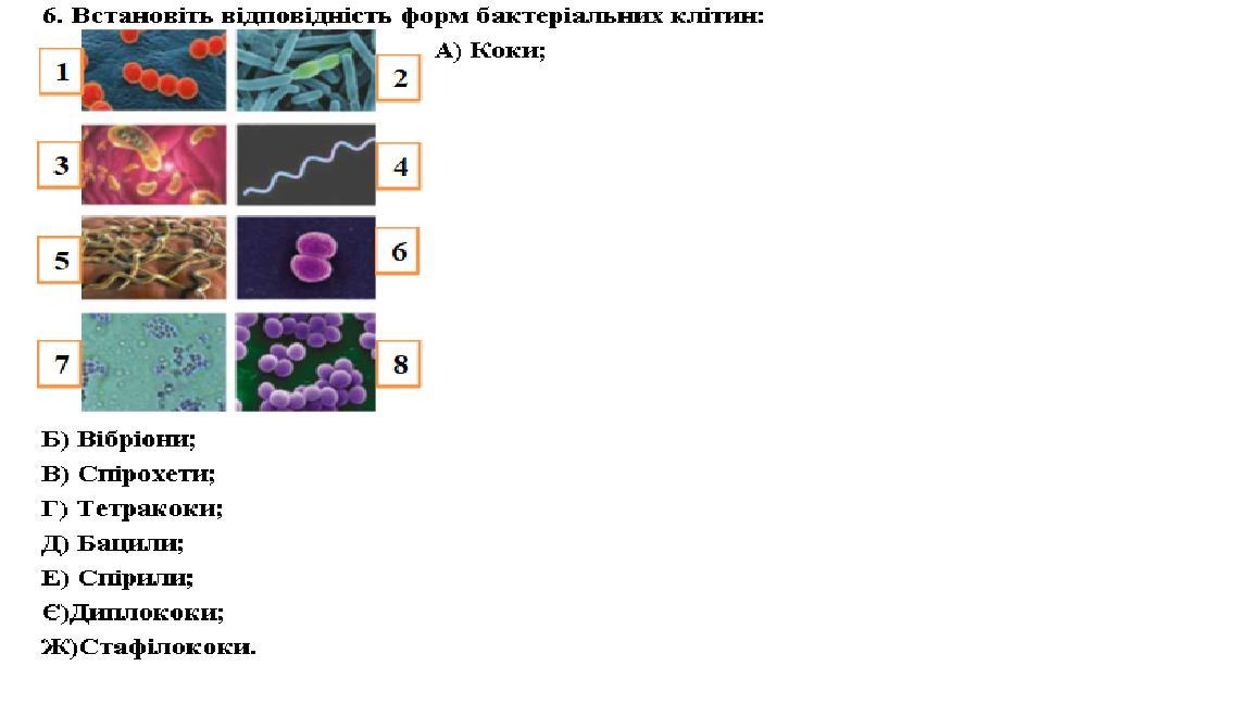 2Д,3Б,4Е,5В,6Є,7Г,8Ж. 1Б,2В,3А