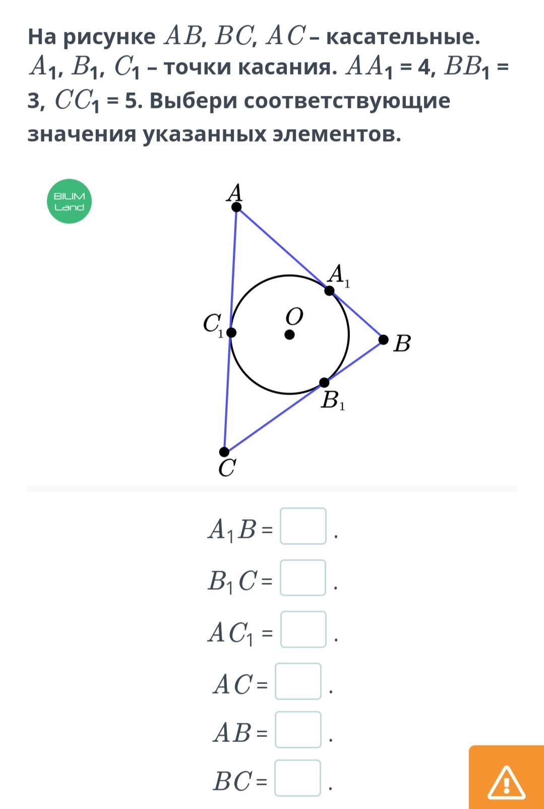 На рисунке AB, BC, AC – касательные. A1, B1, C1 – точки касания. AA1 = 4, BB1 = 3, CC1 = 5. Выбери соответствующие значения указанных элементов.