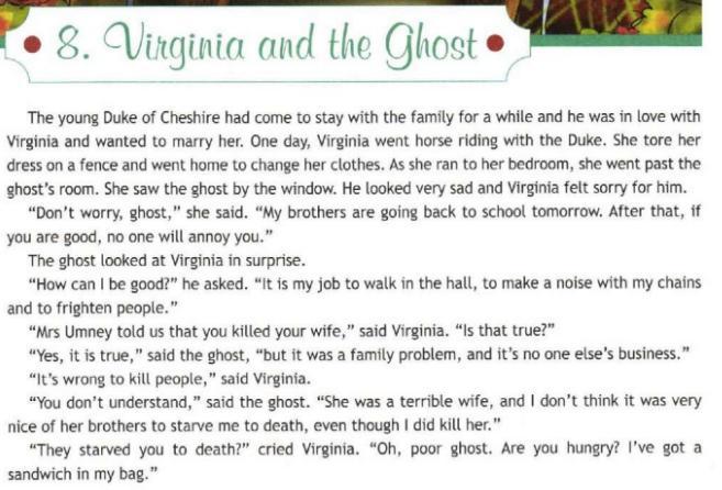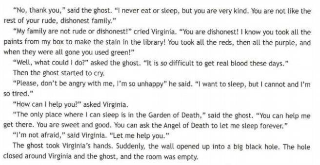 Нет, спасибо», - сказал призрак. «Я никогда не ем и не сплю, но вы очень добры. Вы не похожи на остальных членов вашей грубой, нечестной семьи». «Моя семья не грубая или нечестная!» воскликнула Вирджиния. «Вы нечестны! Я знаю, что вы взяли все краски из моей коробки, чтобы сделать пятно в библиотеке! Вы взяли все красные, затем все фиолетовые, а когда они все исчезли, вы использовали зеленый цвет!» "Ну, что я мог сделать?" спросил призрак. «В наши дни так трудно получить настоящую кровь». Затем призрак заплакал. «Пожалуйста, не сердитесь на меня, я так несчастен», - сказал он. «Я хочу спать, но не могу, и я так устал». "Чем я могу помочь вам?" - спросила Вирджиния. «Единственное место, где я могу спуститься, - это Сад Смерти», - сказал призрак. «Ты можешь помочь мне добраться туда. Ты милый и добрый. Ты можешь попросить Ангела Смерти позволить мне спать вечно». «Я не боюсь, - сказала Вирджиния. "Позвольте мне помочь вам." Призрак взял Вирджинию за руки. Внезапно стена превратилась в большую черную дыру. Дыра закрылась вокруг Вирджинии и призрака, и комната была пуста.