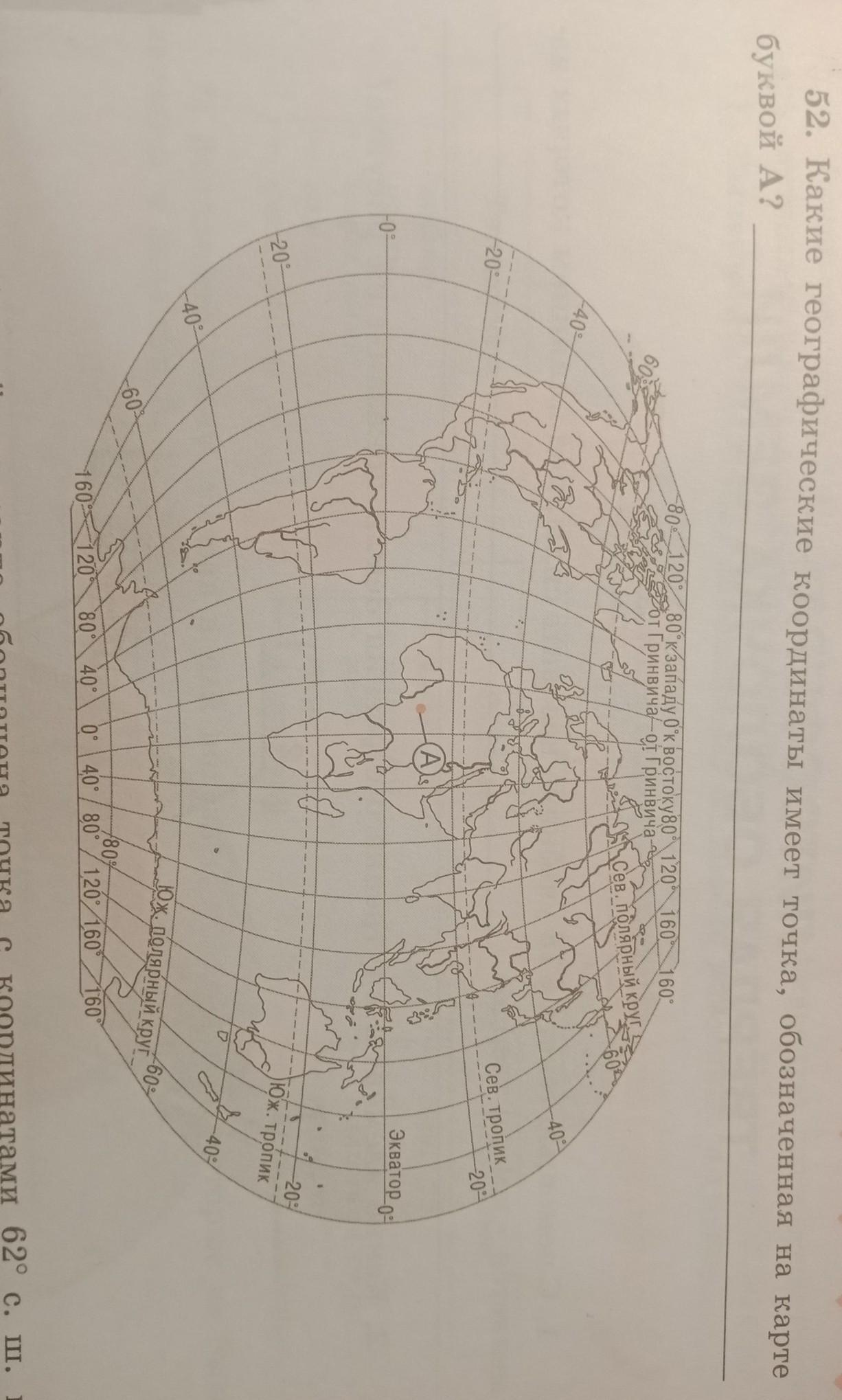 Какие географические координаты имеет точка, обозначенная на карте буквой А