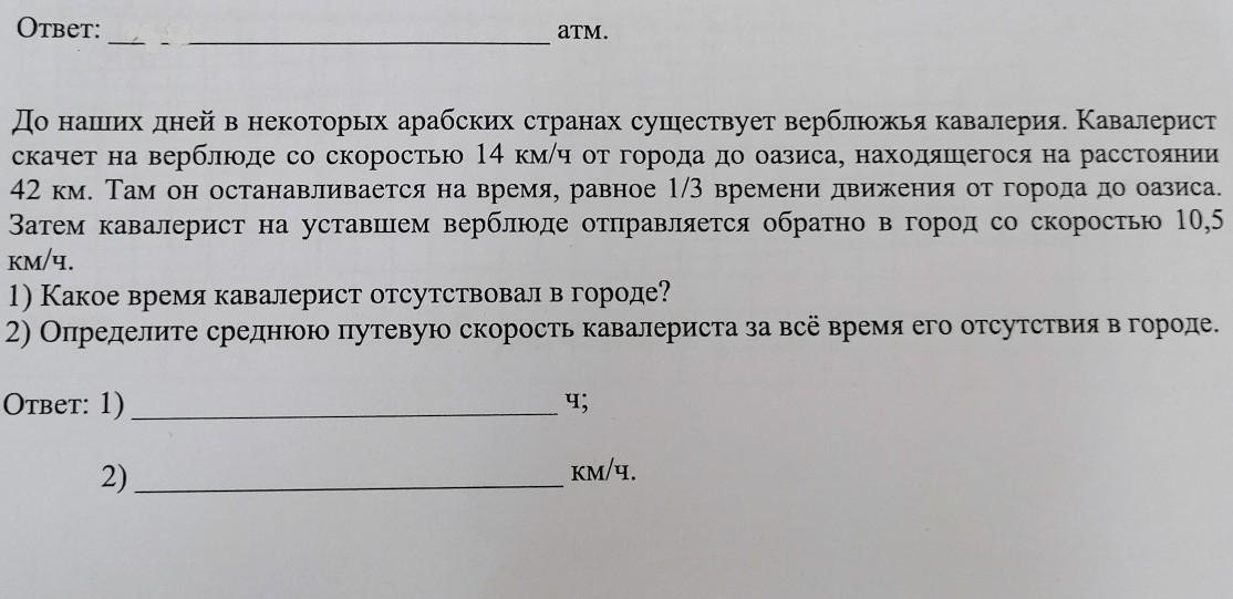 Объяснение: определяем сколько времени скачет кавалерист до оазиса: t1=S/V1=в42/14=3час. Определяем время остановки: to=t1*1/3=3*1/3=1час. Определяем время на обратный путь: t2=S/V2=42/10,5=4час. Определяем время отсутствия кавалериста в городе: t=t1+tо+t2=3+1+4=8час. Определяем среднюю путевую скорость за все время отсутствия кавалериста в городе: Vс=S/t=42/8=5,25км/час.