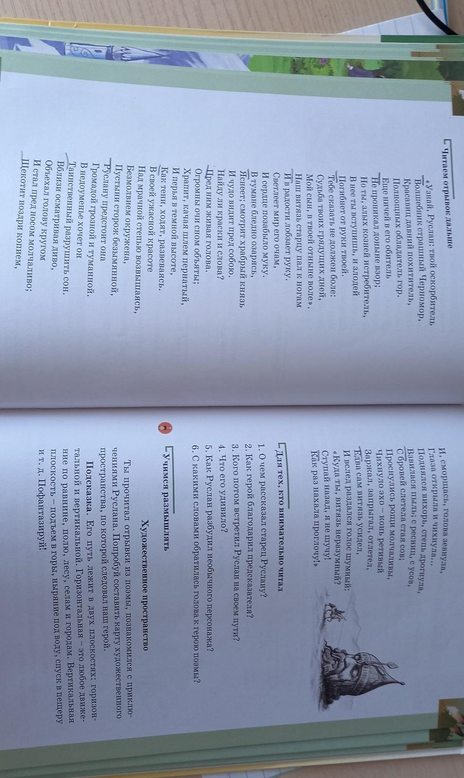 1)Как назыыает страрец черномора? 2)Как Руслан отблогорил старца? 3)Что увидил Руслан на пути? 4)Как ведёт себя Руслан, повстречав "живую голову"? 5)Как Руслан разбудил голову? 6)Что случилось с конём когда чихнула голова? 7)Как вы думаете испугался Руслан или нет? Почему?
