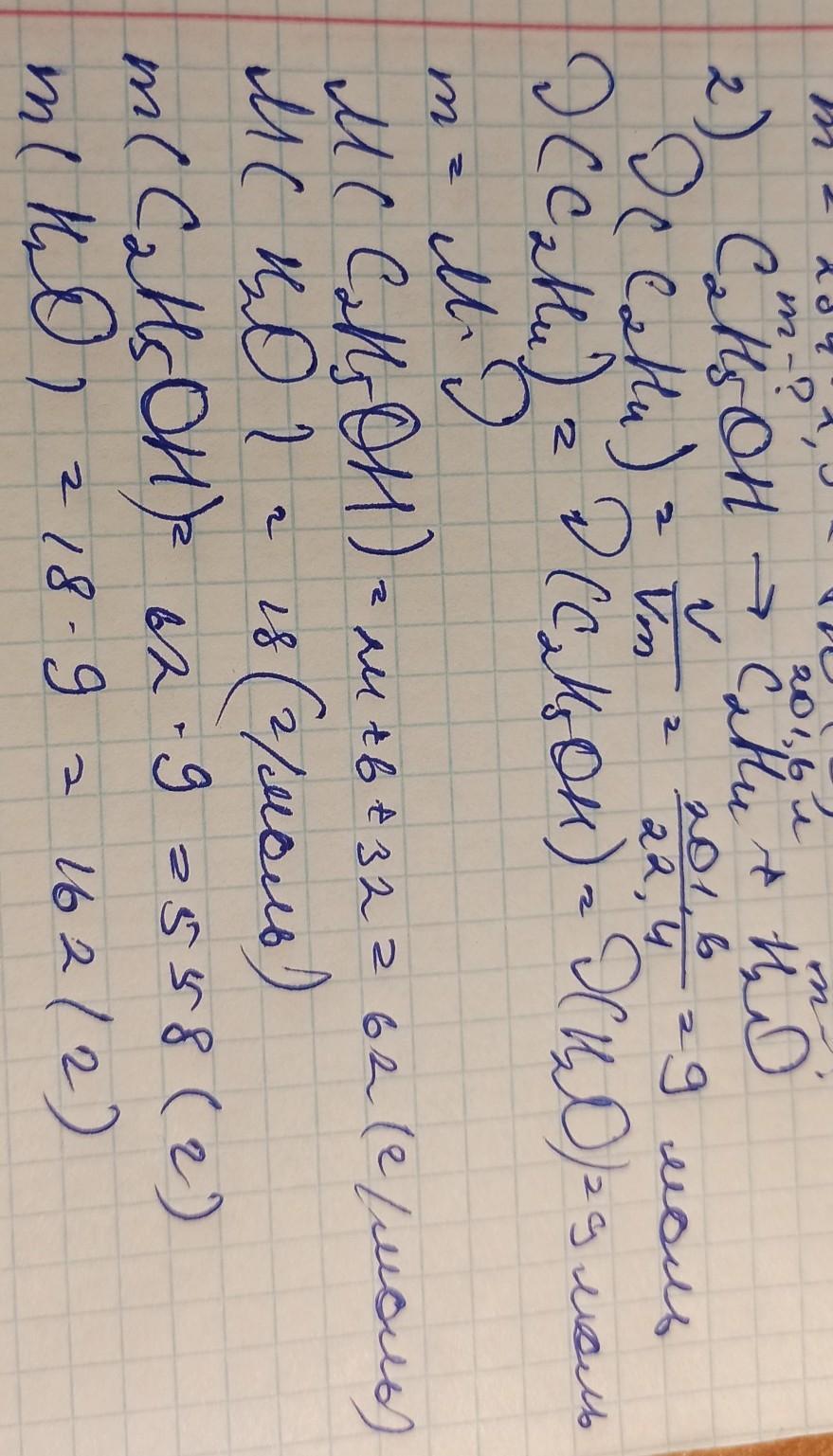 Обчисліть маси етанолу, що вступить у реакцію, і води, що утвориться в реакції добування етену об’ємом 201,6 л.