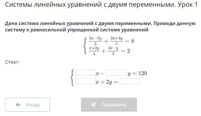 Дана система линейных уравнений с двумя переменными. Приведи данную систему к равносильной упрощенной системе уравнений