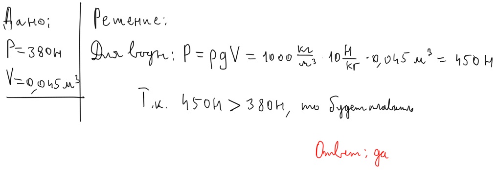 Вес тела в воздухе равен 380 ньютон,а объем равен 0,045 .м. кубических . Может ли это тело плавать в воде.