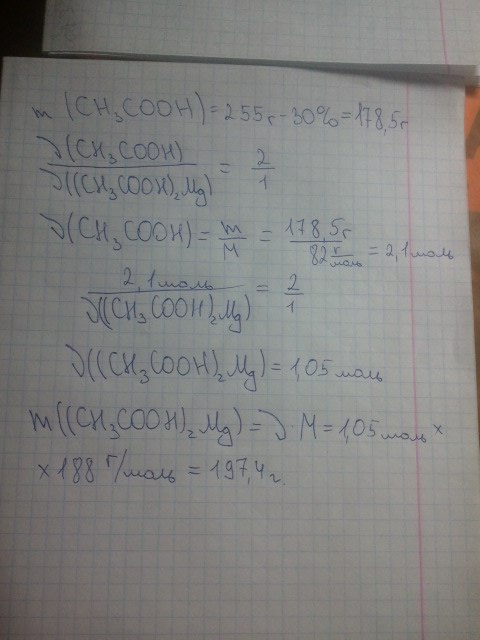 Вычислите массу соли, полученной в результате взаимодействия 255 г 30% - го раствора уксусной кислоты с оксидом магния.