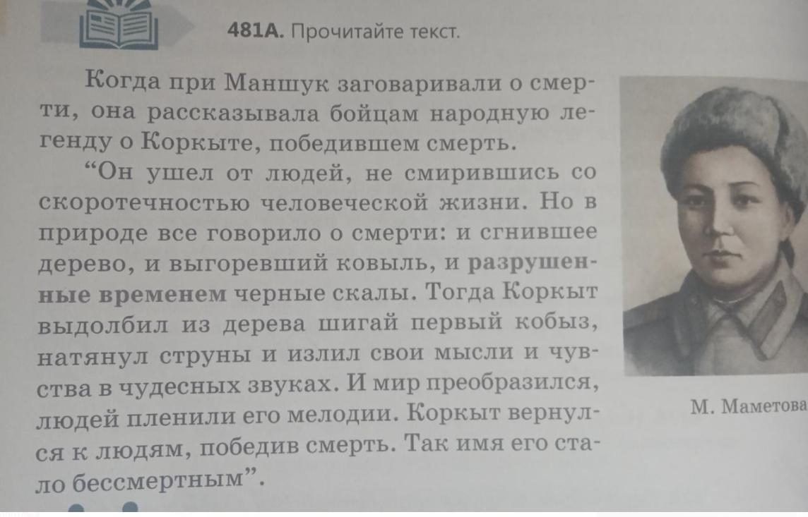 "Он ушел от людей, [не смирившись — обстоятельство (деепричастие)] со скоротечностью человеческой жизни. Но в природе все говорило о смерти: и [сгнившее — определение (причастие)] дерево, и [выгоревший — определение (причастие)] ковыль, и [разрушенные — определение (причастие)] временем черные скалы. Тогда Коркыт выдолбил из дерева шигай первый кобыз, натянул струны и излил свои мысли и чув ства в чудесных звуках. И мир преобразился, людей пленили его мелодии. Коркыт вернулся к людям, [победив — обстоятельство (деепричастие)] смерть. Так имя его стало бессмертным".