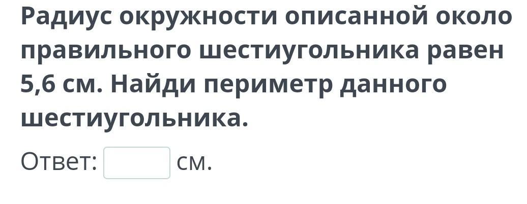Радиус окружности описанной около правильного шестиугольника равен 5,6 см. Найди периметр данного шестиугольника.
