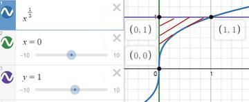 теперь можем искать объем, как разницу объемов тел, вращаемых вокруг оси ох, V1 - образованного вращением квадрата 1х1 и V2 "чашей" образованной вращением у = ∛х