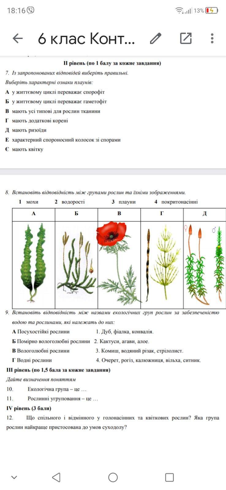 12. 1) У голонасінних, папоротей, квіткових рослин спільним є здатність до розмноження, процес запліднення, наявність статевих клітин. Найменше пристосована до умов суходолу папороть, жодний представник голонасінних не живе у водному середовищі.