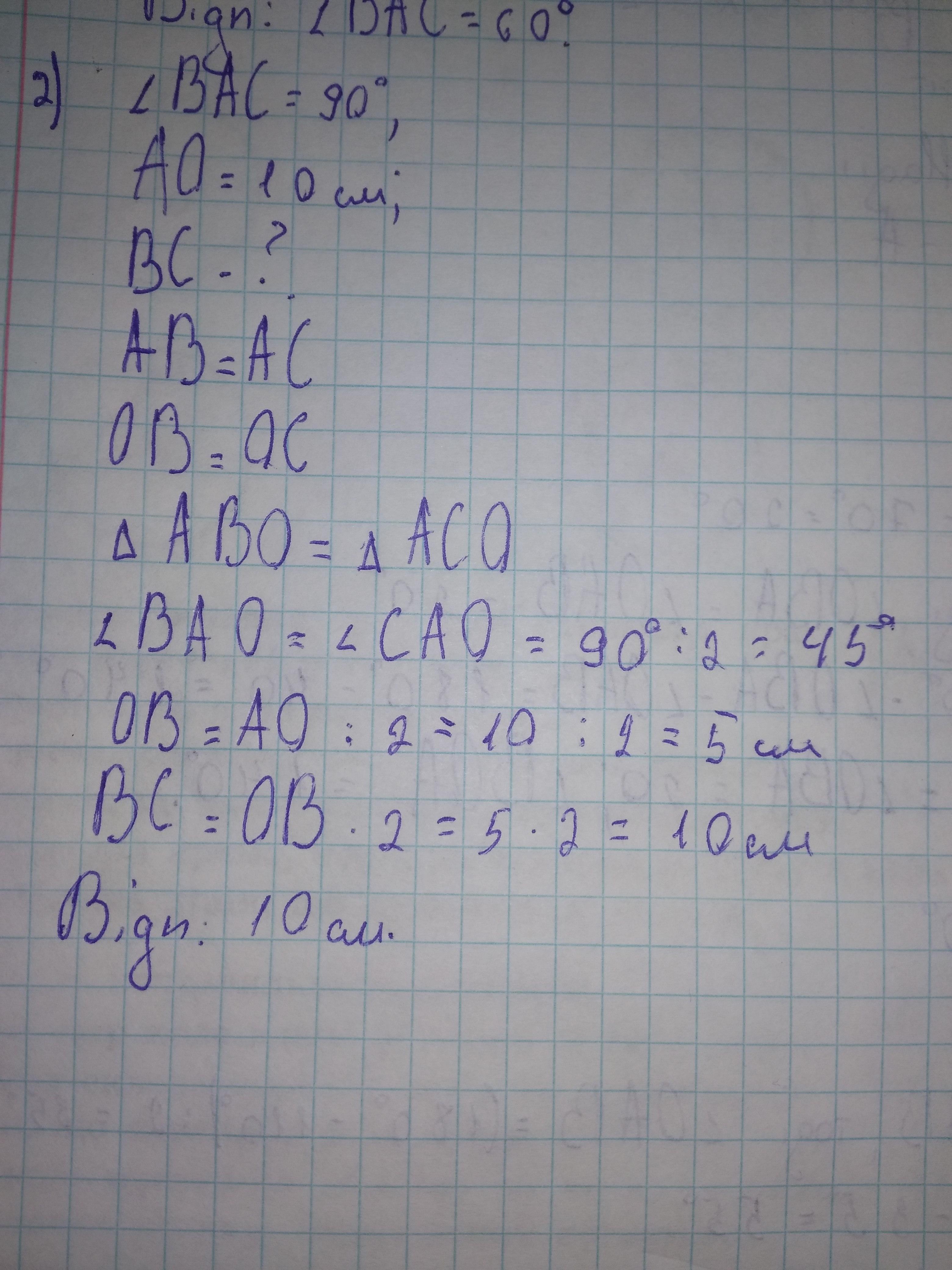 До кола з центром у точці О з точки А поза колом проведено дві дотичні АВ і АС (точки В і С - точки дотику). Знайдіть ВС, якщо ∠BAC = 90°, АО = 10 см.