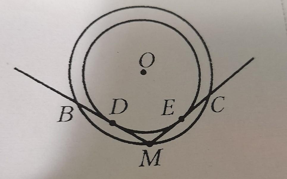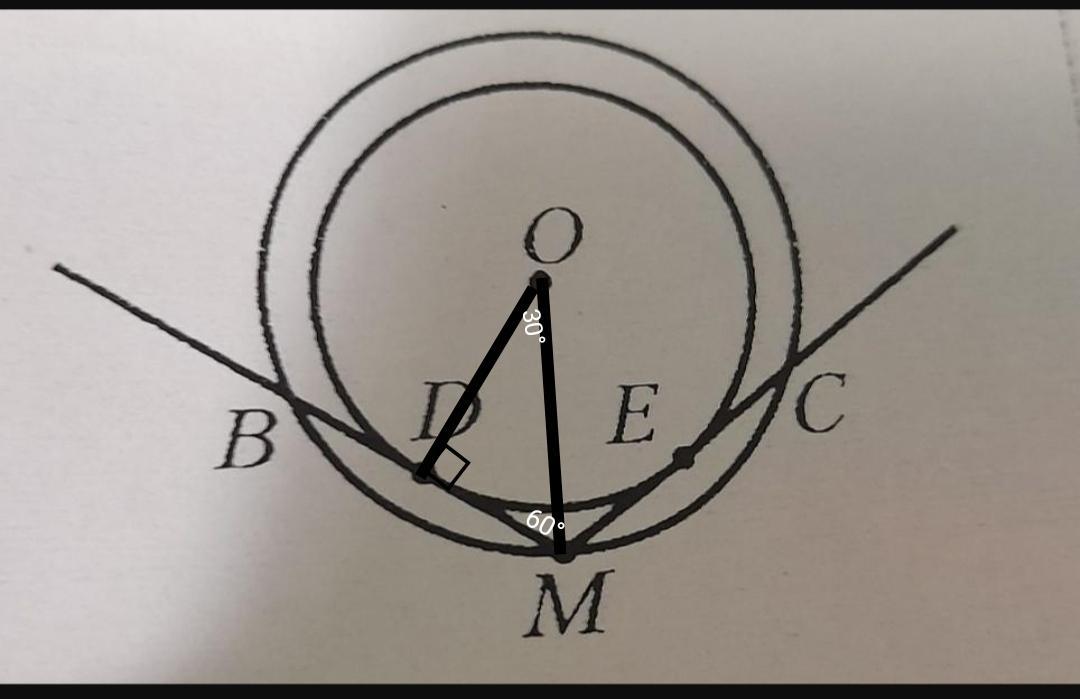 На рисунке 196 две окружности имеют общий центр О. Через точку М большей окружности проведены касательные MB и МС к меньшей окружности. Найдите радиус большей окружности, если MD = 14 см, a ∠BMC = 120°.