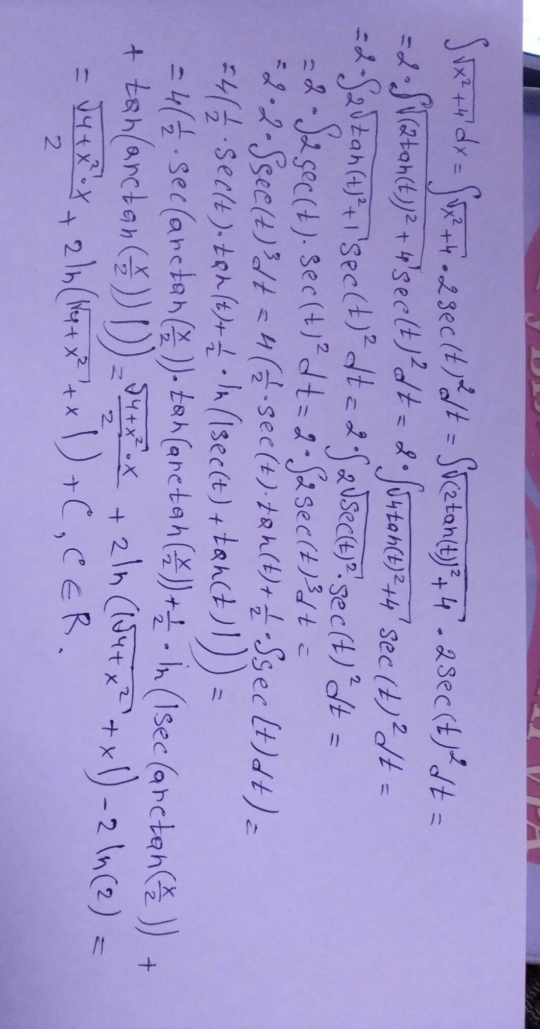 ∫√(x^2+4)dx=4∫ch^2 y dy=sh^2(2y) +2y+C