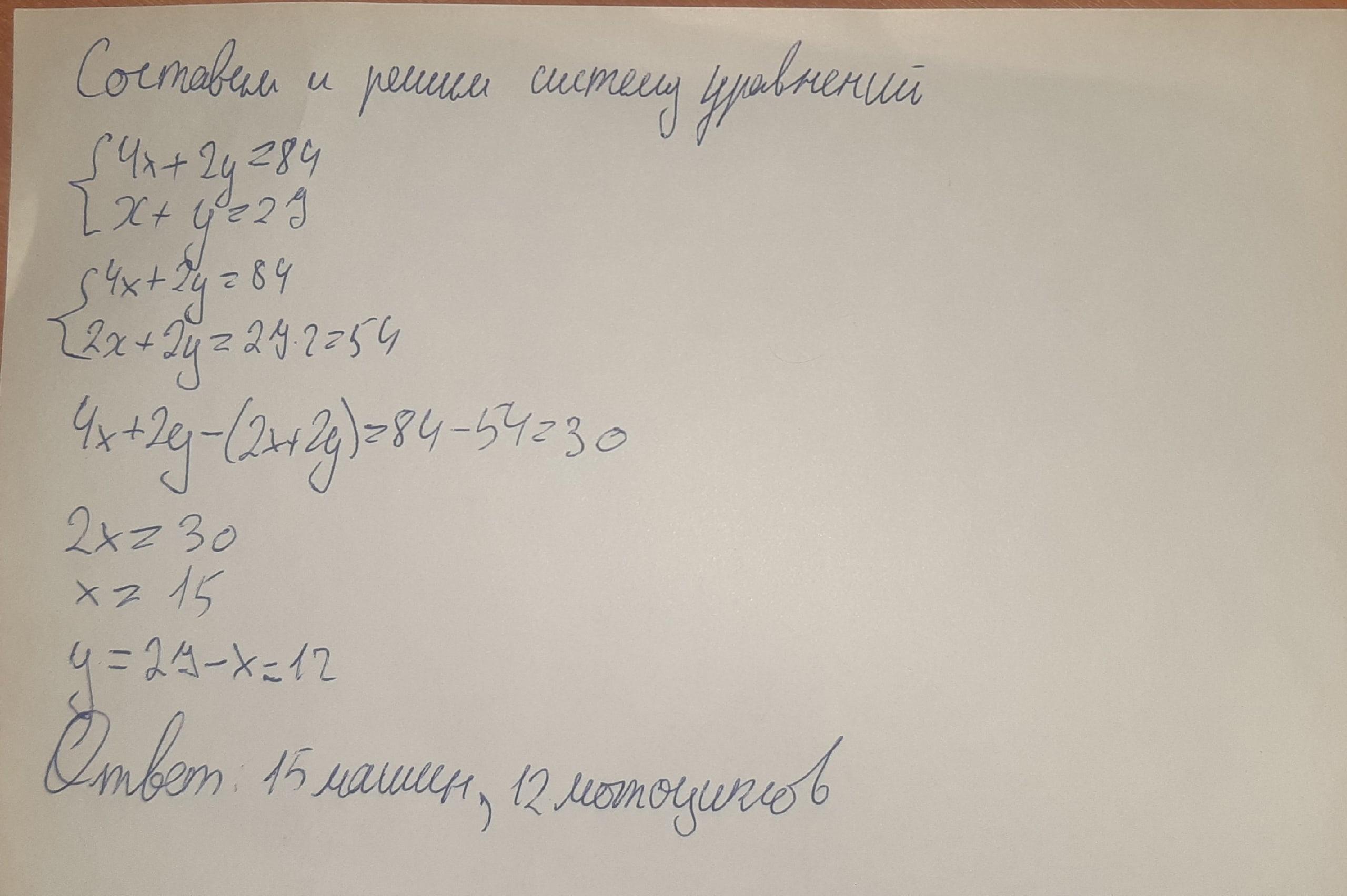 На парковке стоят машины и мотоциклы. У каждой машины по 4 колеса, а у каждого мотоцикла по 2 колеса. Яша насчитал на парковке 84 колеса и 27 транспортных средств. Сколько на парковке мотоциклов?