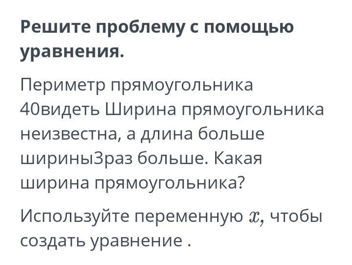 Решите проблему с помощью уравнения. Периметр прямоугольника 40 см. Ширина прямоугольника неизвестна, а его длина в 3 раза больше ширины. Какая ширина прямоугольника? Используйте переменную x, чтобы создать уравнение. ( + ) ⋅ знак равно ⋅ знак равно знак равно : знак равно знак равно : знак равно Ответ: ? ширина видеть