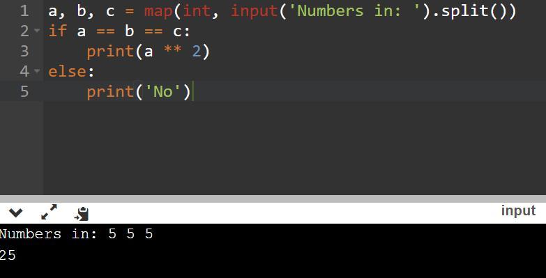 Python. На вході програми маємо три натуральних числа a, b і c, записані в одному рядку через пропуск. У відповідь потрібно вивести квадрат будь-якого з заданих чисел, якщо існує рівносторонній трикутник з довжинами сторін a, b, c і повідомлення No у протилежному випадку