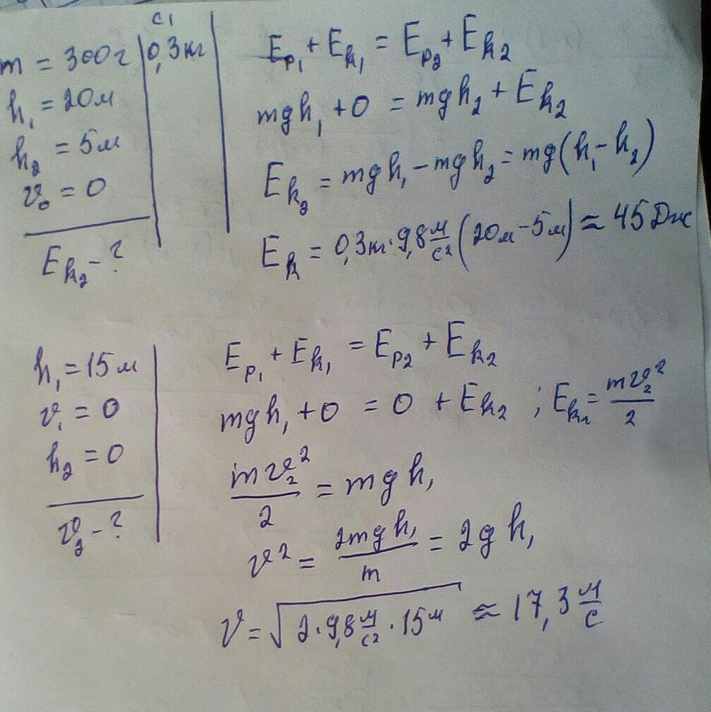 1)Маса тіла 300 грам, його впустили з висоти 20 метрів, знайти кінетичну енергію на висоті 5 метрів