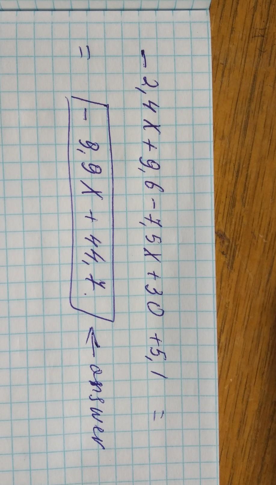 = -2,4х + 9,6 - 7,5х + 30 + 5,1 = -9,9х + 44,7