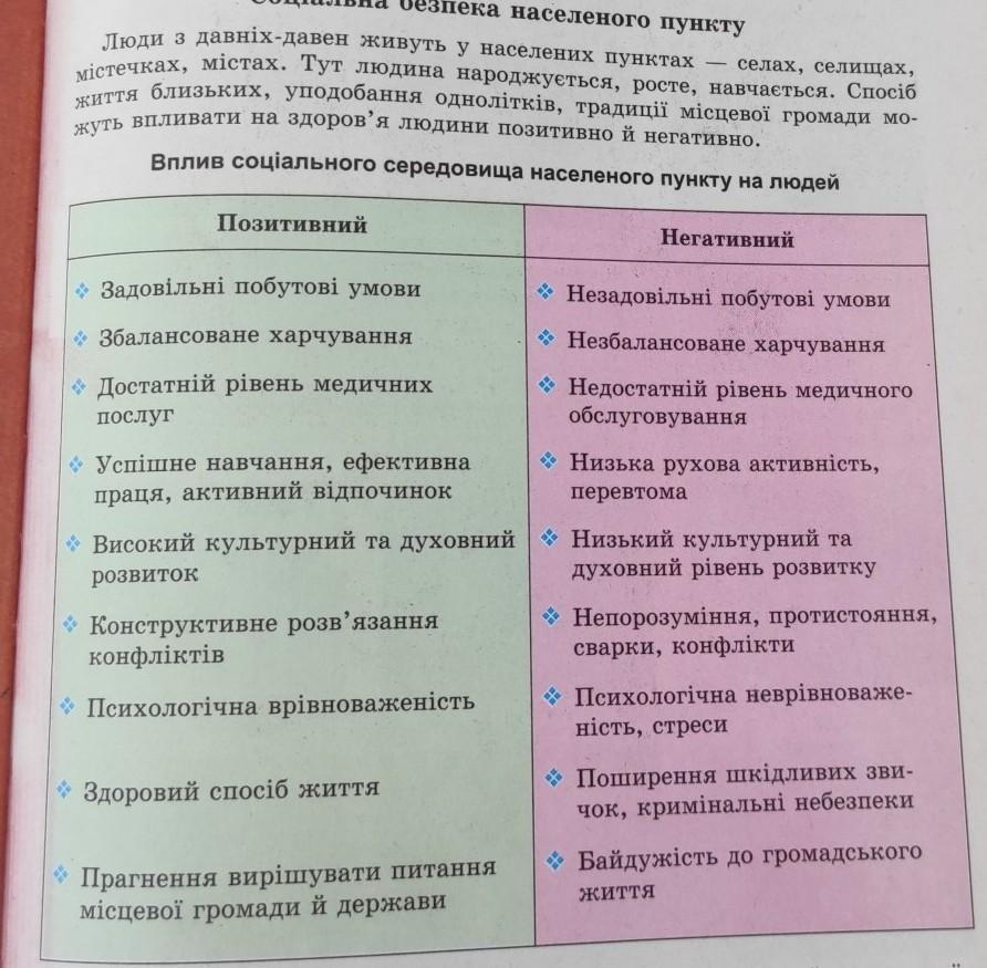 Основи здоров'я.7 клас. Проаналізуй схему на с. 87. Яким буває вплив середовища на мешканців населеного пункту? Схарактеризуй на вибір.