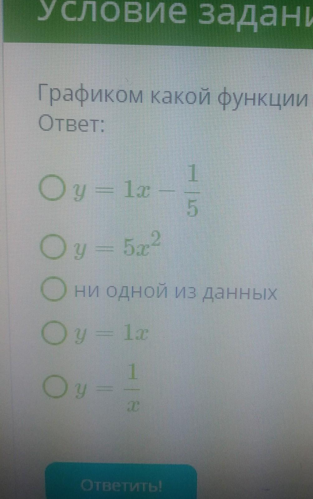 Гипербола в своём уравнении имеет k/х значит, правильный ответ: у=1/х