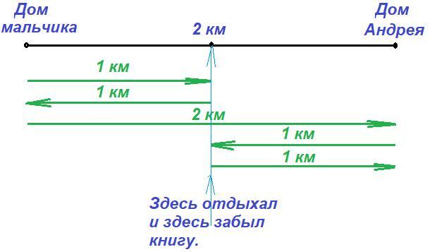 рассеянный мальчик вышел из дома и пошёл к своему другу Андрей расстояние между их домами 2 км когда он прошел половину пути и сел отдохнуть то вспомнил что забыл дома книгу мальчик вернулся домой взял книгу и снова пошел к Андрею когда он Он снова пошел к Андрею когда он Подошёл к дому Андрея то вспомнил что забыл сумку на том месте где присел чуть-чуть отдохнуть мальчику пришлось вернуться за сумкой и снова идти к другу когда он пришел к Андрею то понял что вместо 2 км прошёл гораздо больше Сколько километров прошёл мальчик