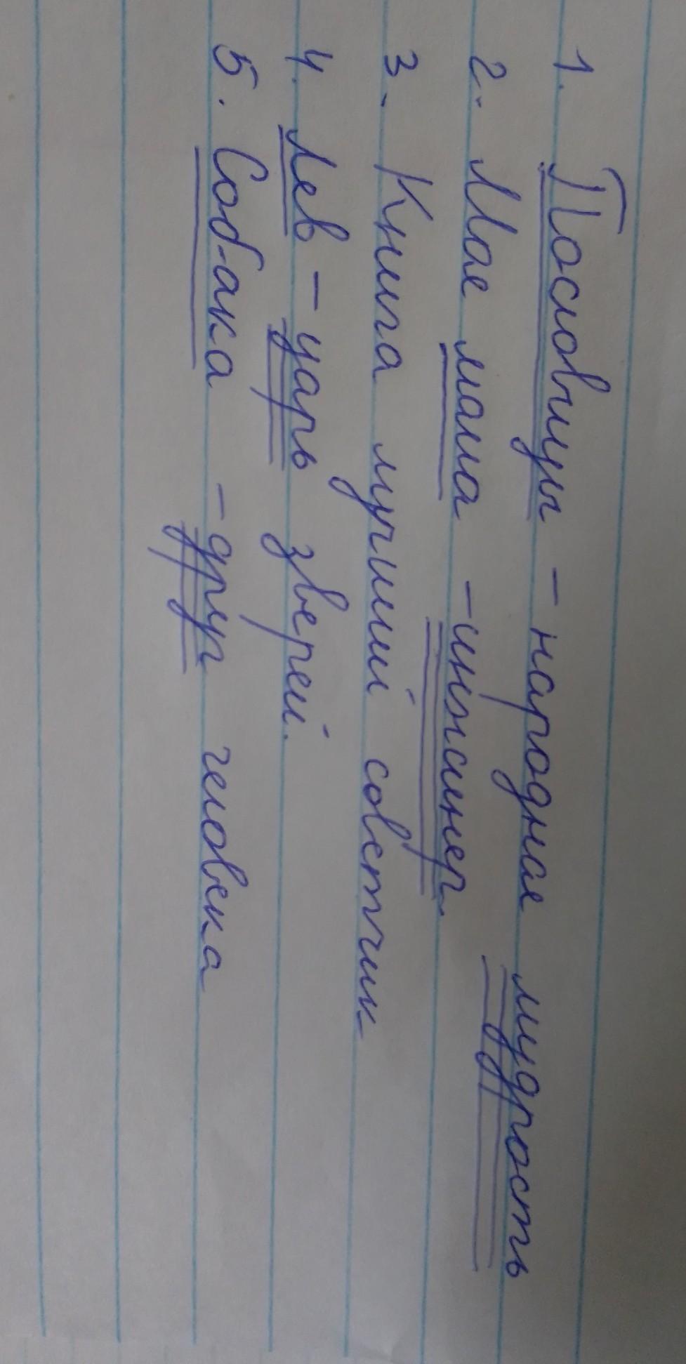 Спишите предложения подчеркните главные члены предложения .Определите каким частям речи они выражены. Укажите их формы. 1)Пословицы-народная мудрость .2)Моя мама-инженер. 3)Книга-лучший советчик .4)Лев-царь зверей .1)Собака-друг человека.